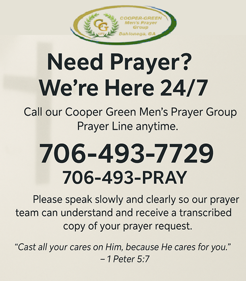 The Cooper-Green Men’s Prayer Group —a men’s prayer group that has been meeting in Dahlonega, Georgia, since 1972. We meet every Tuesday at 7 AM. Men in the area, we meet in the fellowship hall of Dahlonega Baptist Church, and you are welcome to come and join us! We are a group of men of the community, Bible-believing, praying men of multiple denominations and all ages who believe in the power of prayer. In addition to our commitment to prayer, each week, we have a group member or a guest speaker who delivers a 15–20-minute devotional and/or personal testimony. Men, we welcome and encourage you to join with us for prayer, devotion, fellowship, and coffee on Tuesday mornings in person or on Zoom. NOTE: Each week, a Zoom Meeting Login link is posted on the PrayerLink Prayer wall and emailed to all registered Prayer Partners